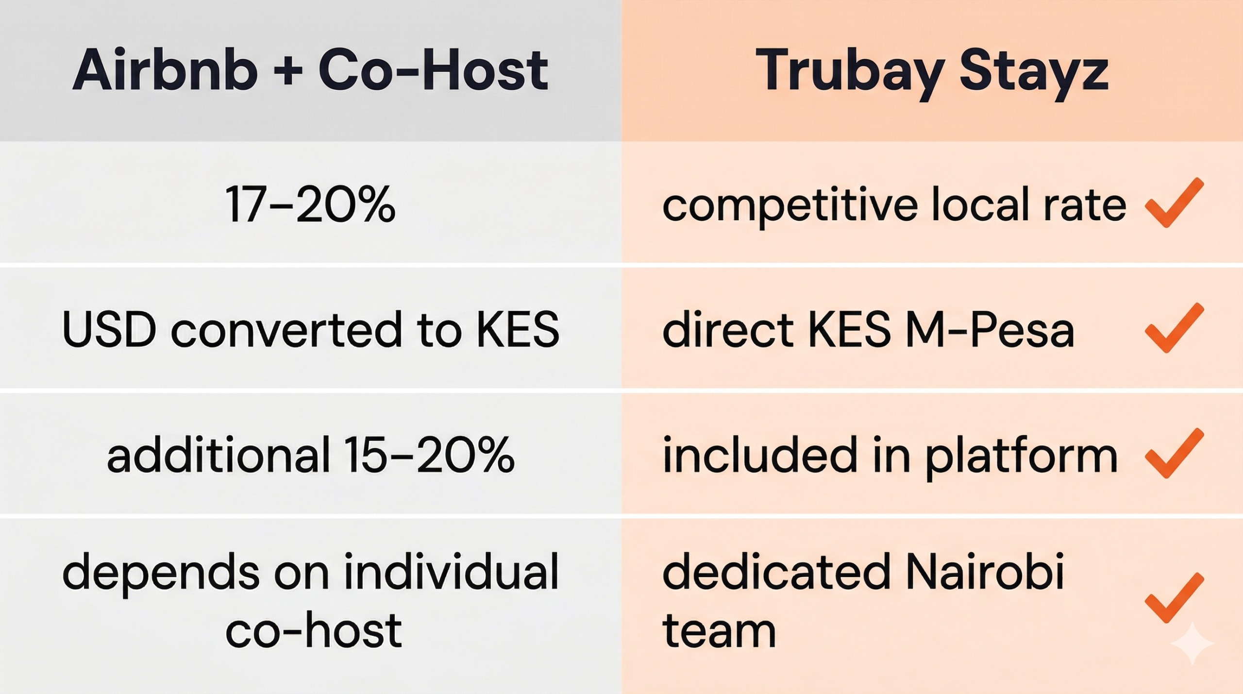 | Trubay Stayz Platform | Full local management + M-Pesa payouts + KES pricing + dedicated host support | Competitive local rates | Hosts wanting a fully managed Kenya-specific solution with no currency losses |