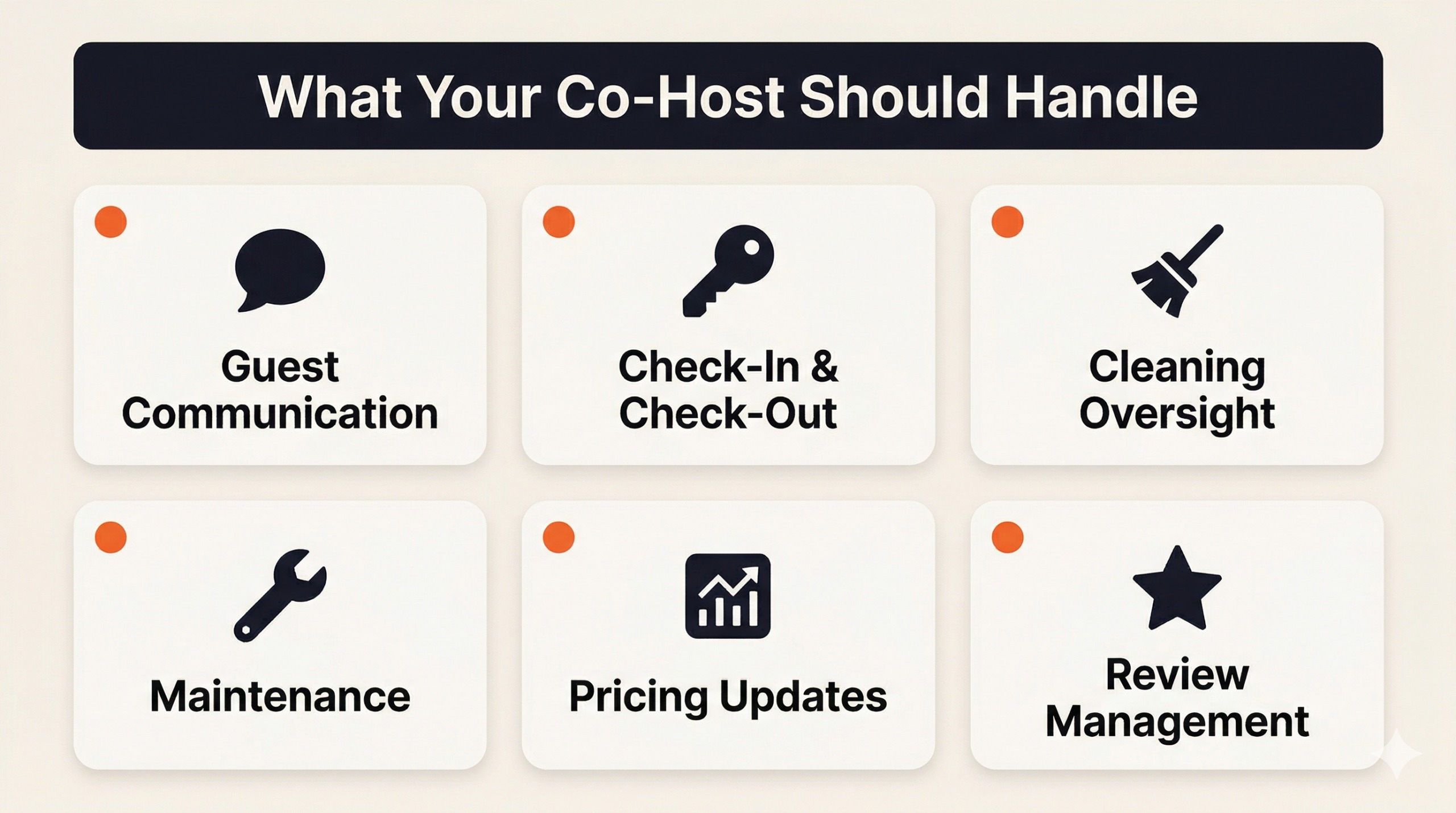 - Cleaning oversight. Coordinating with your cleaning team to ensure the property is turned over between bookings to a consistent standard. The co-host does not necessarily clean the property themselves — they manage the process.